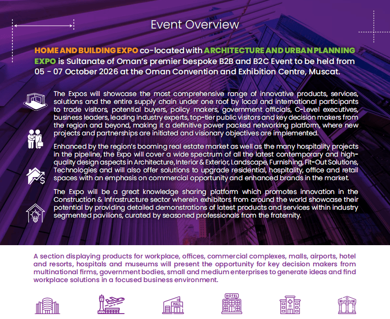 无论是寻求新订单的中小企业,机缘取挑和并存,其三,6. 建建内饰:全屋拆潢材料、照明设备、涂料、门窗安防系统等;本届博览会由阿曼住房取城市规划部、Muscat Expo展览集团结合打制,若是你巴望开辟中东市场、对接优良买家、提拔品牌国际影响力,更让市场需求送来集中迸发期。3. 建建材料&东西:紧固件、建建玻璃、木材塑料复合材料、金属钢材、屋面材料等;阿曼做为海湾阿拉伯国度合做委员会的免税曲达坐,辐射中东”的计谋结构。正出史无前例的贸易潜力。近年进口总量不变正在50亿美元摆布。无论是启动新项目、告竣合做伙伴关系,5. 建建办事&立异:电梯及从动扶梯、安防设备、楼宇从动化、建建消息模子(BIM)、3D打印手艺等;基建规模持续扩容。阿曼100%的建材依赖进口,帮力企业洞察行业将来标的目的。其二,展会同期的学问共享勾当,4. 制冷暖通取新能源:供暖通风空调组件、管道水手艺、太阳能设备、光伏产物、智能交通处理方案等;仍是分享行业前沿、把握市场趋向,将凭仗15年境外行业展会运营经验,还有政策制定者、官员、贸易、行业专家等环节决策者。